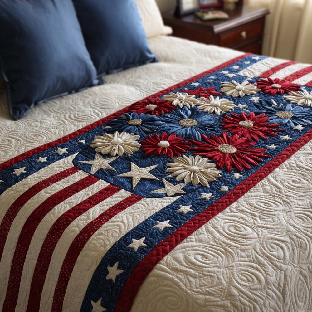 Americana Bloom Quilted Bed Runner – Classic Floral & Patriotic Motif Decorative Bed Scarf, Reversible Cotton Blend For Timeless Country-Chic Bedrooms