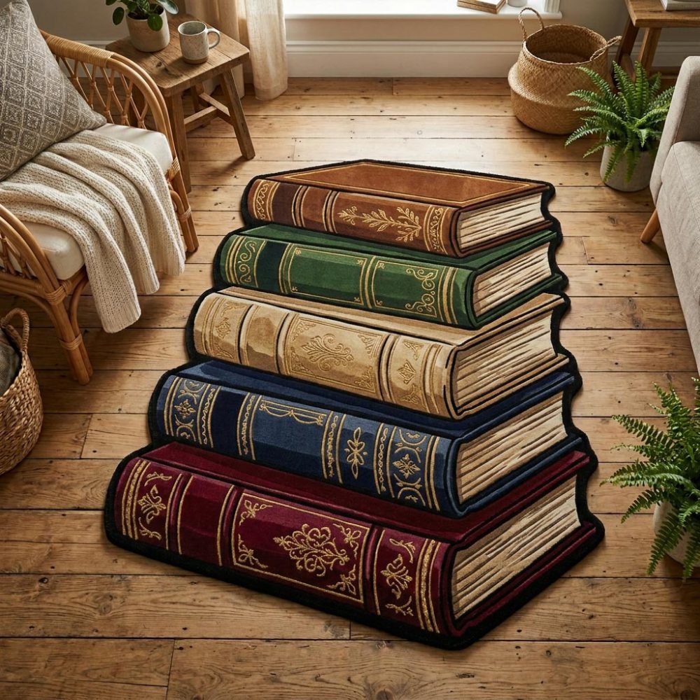ancient tome rug, book shaped rug, custom shape area rug, reading nook rug, library rug, novelty floor mat, non slip custom rug, durable decorative rug