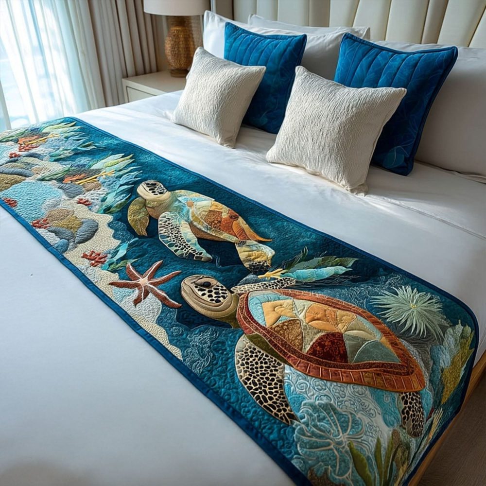 Aquatic Adventurer Quilted Bed Runner — Ocean Explorer Design With Marine Life Embroidery, Cotton Accent For Coastal Bedrooms