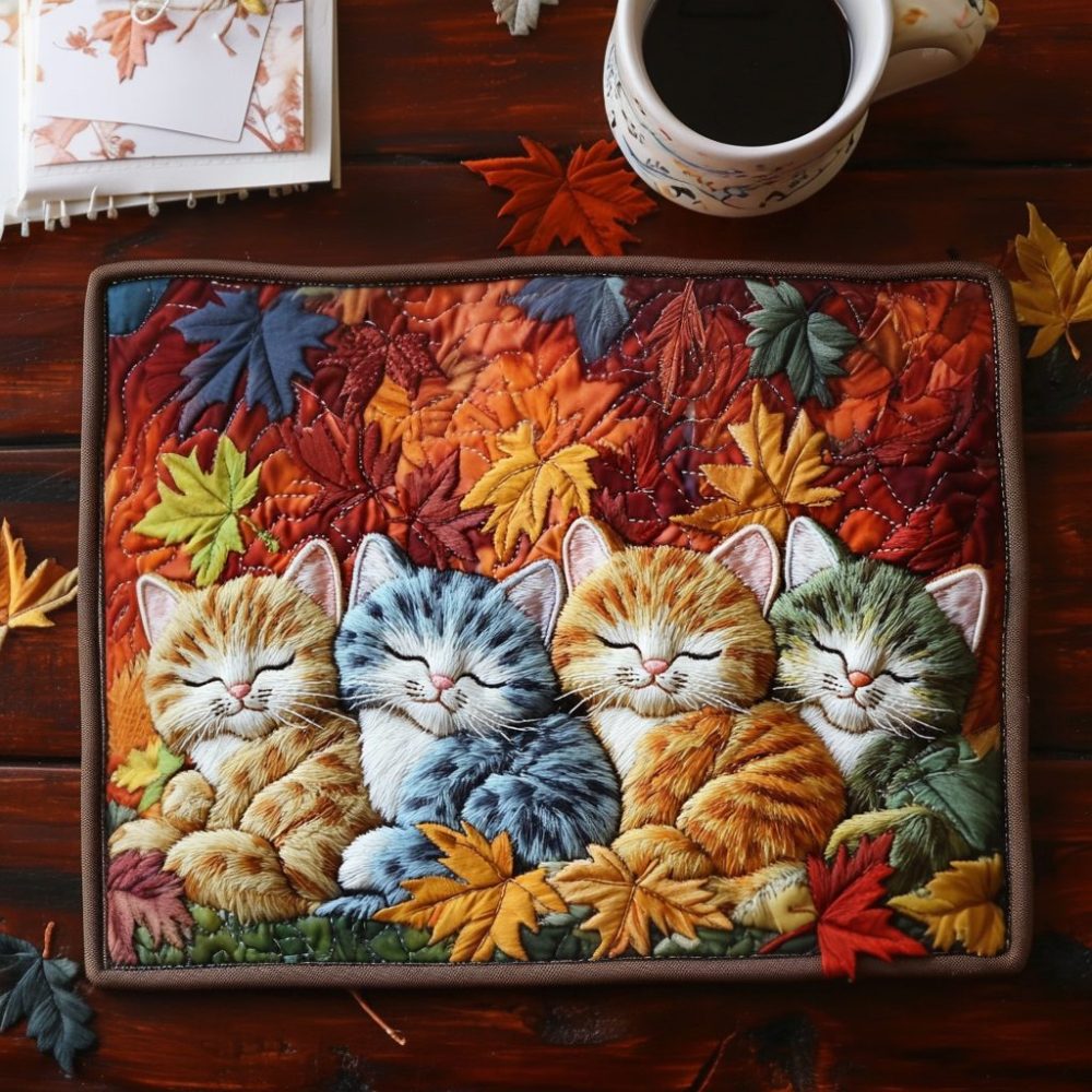 autumn cozy cat placemat, cat motif placemat, quilted fall placemat, washable dining mat, insulated placemat, kitchen decor cat