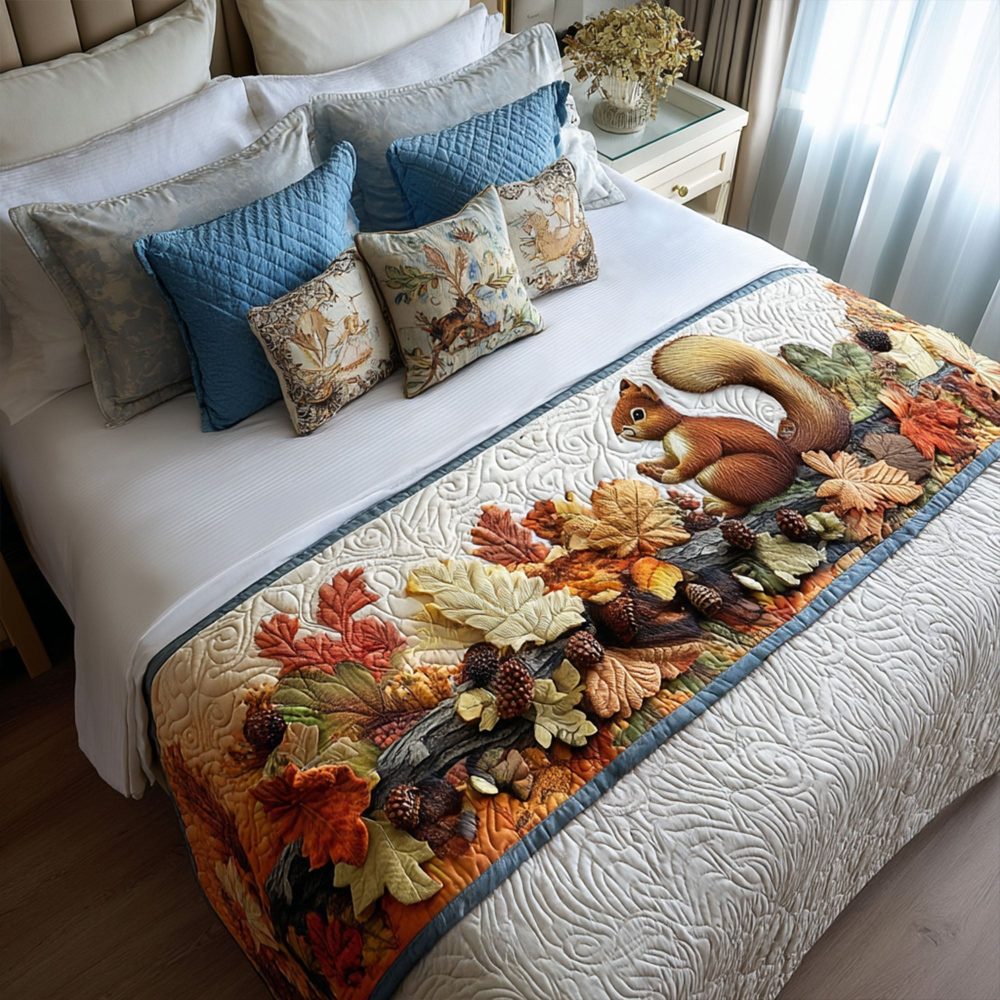 Autumn Squirrel Quilted Bed Runner — Fall Woodland Bedding Accent, Cozy Quilted Throw With Leaf & Squirrel Motif, Machine Washable For Seasonal Decor