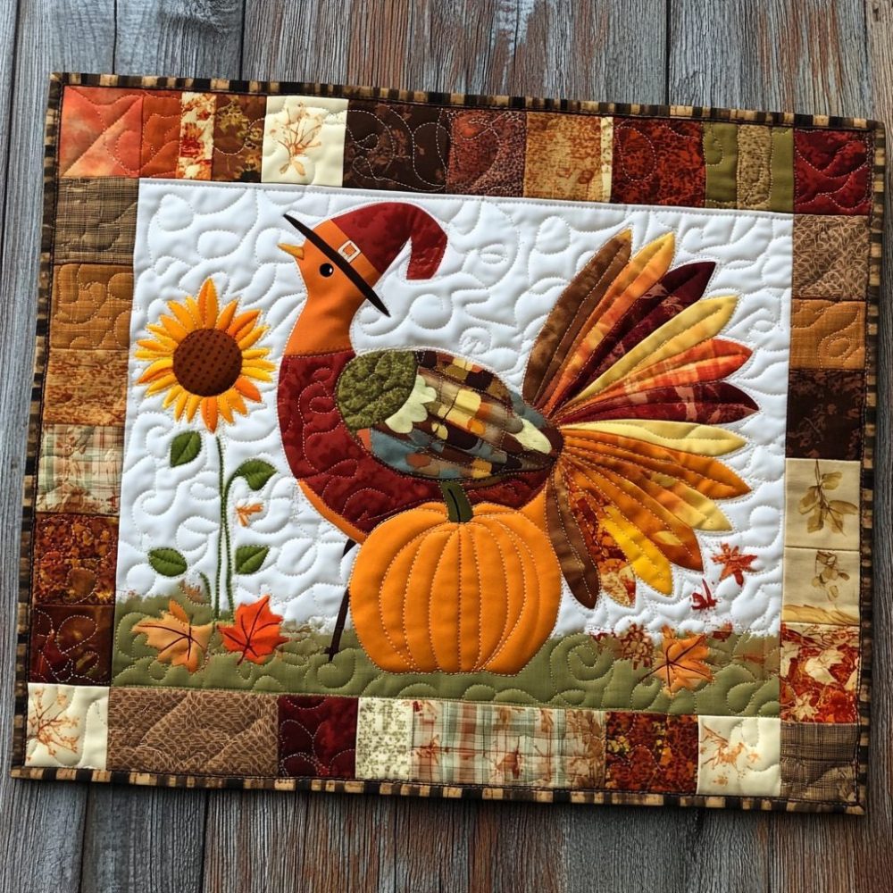 autumn sunflower turkey placemat,fall placemat,thanksgiving table decor,quilted sunflower placemat,cotton blend,heat resistant,machine washable