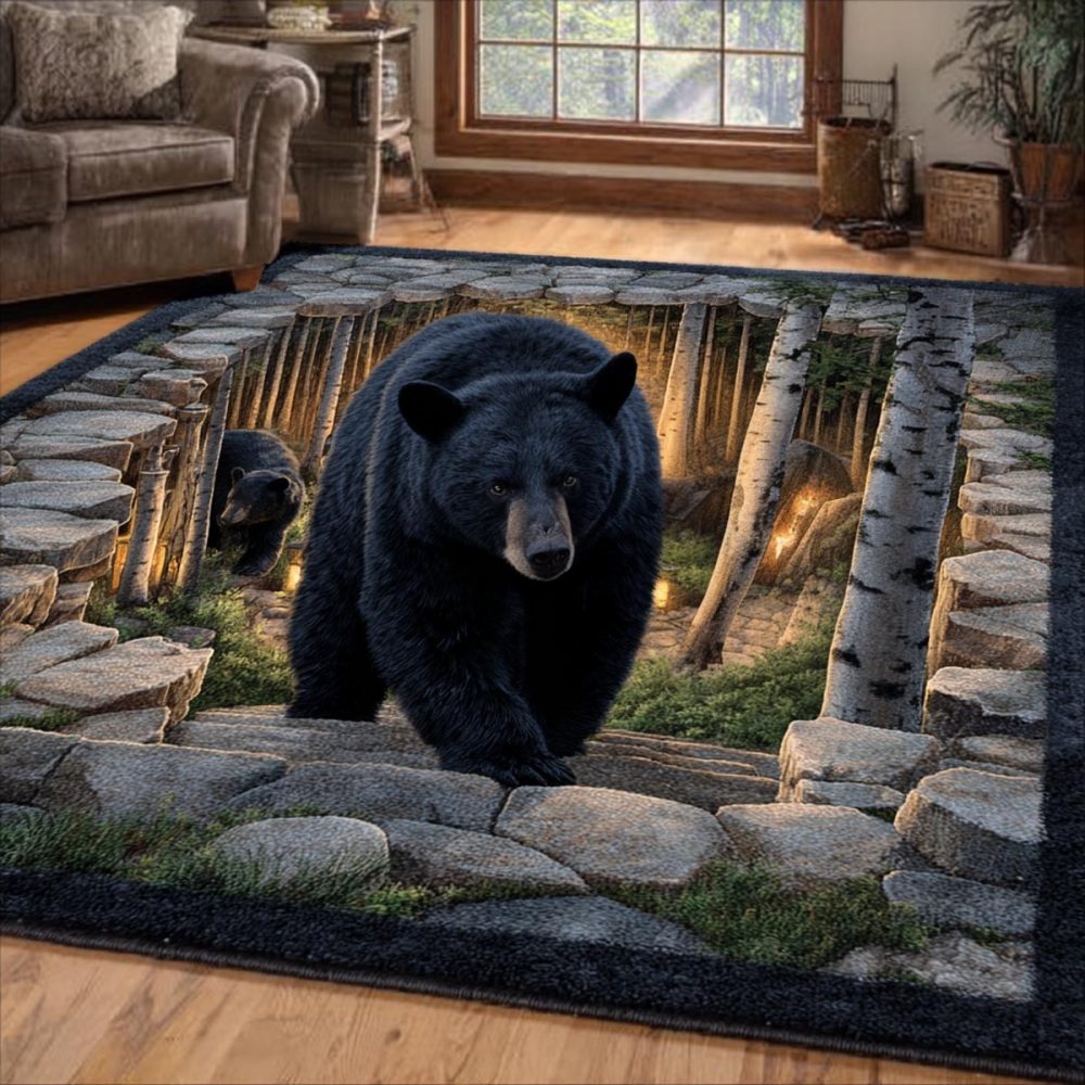 bear horizon rug,rustic area rug,cabin decor rug,lodge accent rug,wildlife motif rug,den rug,living room rug,durable area rug