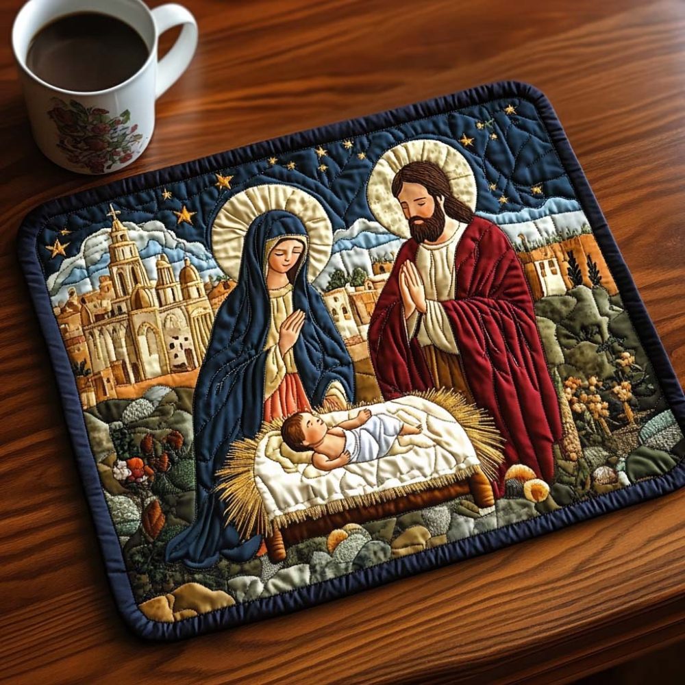 bethlehem eve placemat,nativity placemat,holiday quilted placemat,christmas table mat,cotton blend placemat,heat resistant,machine washable