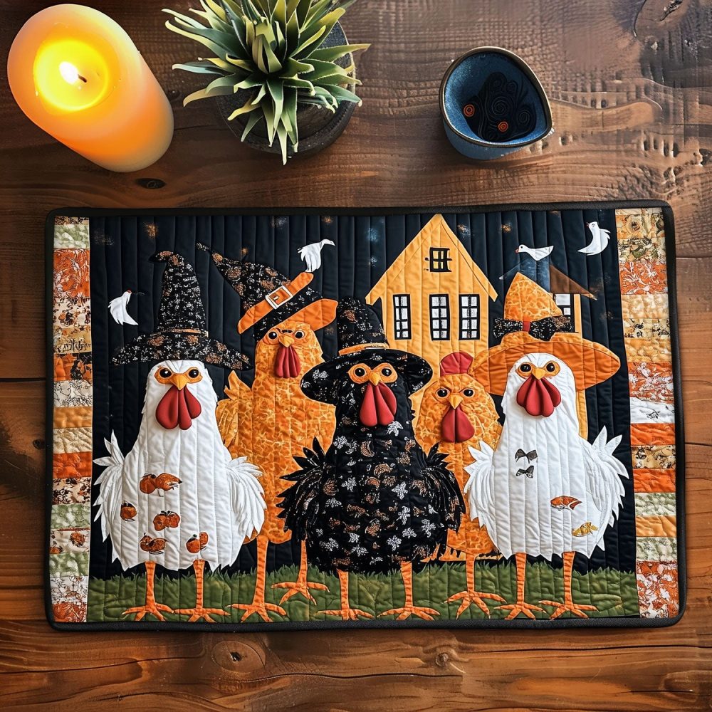 Enchant your dining with the Bewitched Chickens quilted placemat — adorable spellbound hens printed on soft, quilted cotton for a whimsical Halloween accent. The padded quilting protects surfaces and adds cozy texture to place settings while remaining easy to care for in the washing machine. Ideal for fall dinners, themed parties, and gifting to lovers of quirky farmhouse décor. Add this magical placemat to your cart to charm your table this season.