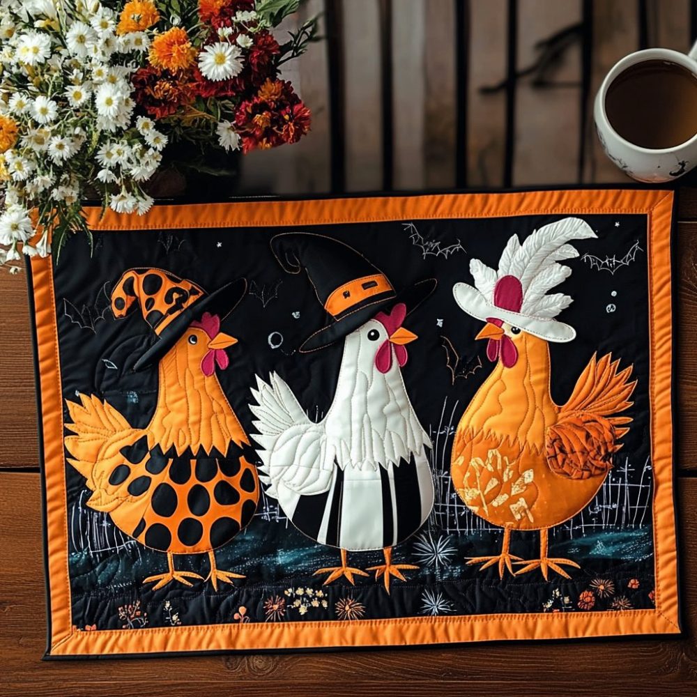 bewitched chickens placemat, witch chicken placemat, Halloween placemat, quilted placemat, machine washable placemat, heat resistant, seasonal table decor