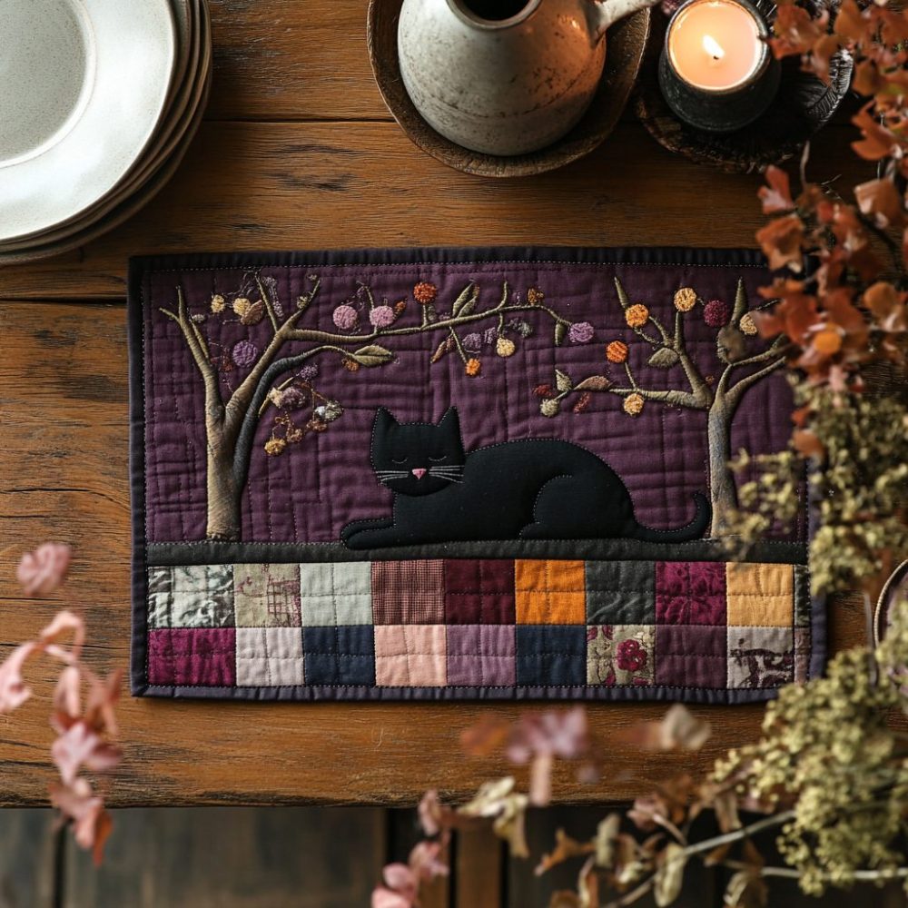 black cat placemat,noir placemat,quilted luxury mat,cat silhouette placemat,machine washable placemat,protective table mat,gift-ready placemat