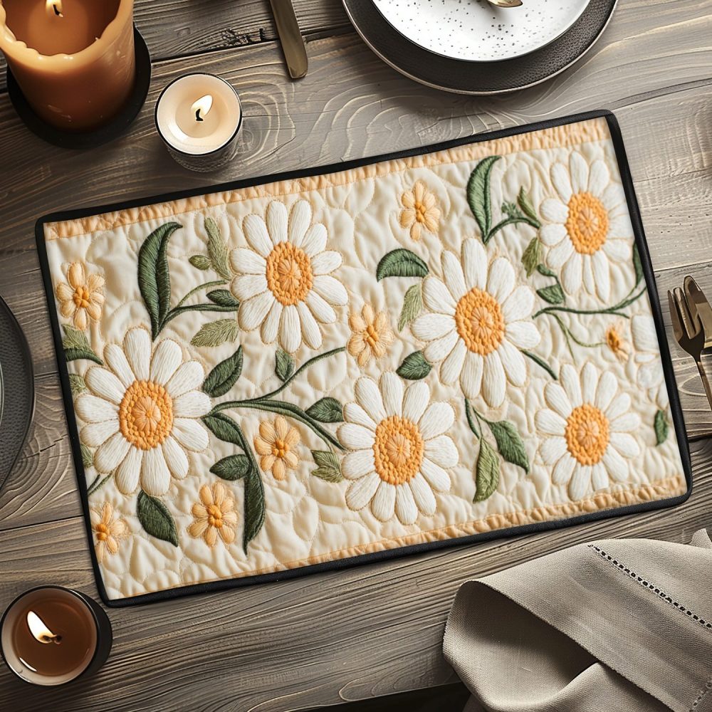 elegant floral placemat, quilted placemat, bloom pattern placemat, heat-resistant placemat, machine washable placemat, table styling, floral table decor