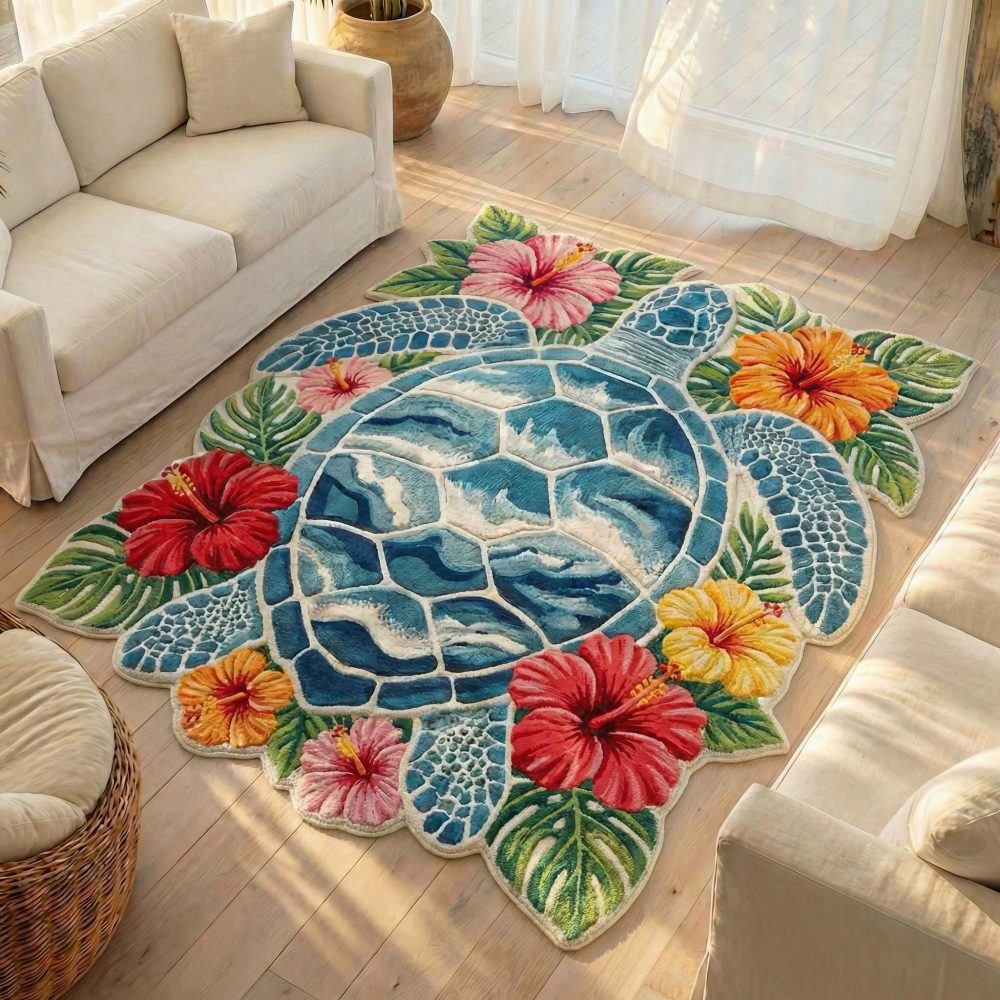 turtle-shaped rug,custom animal rug,bloom turtle rug,floral animal rug,non-slip kids rug,beach house accent rug,custom cut area rug