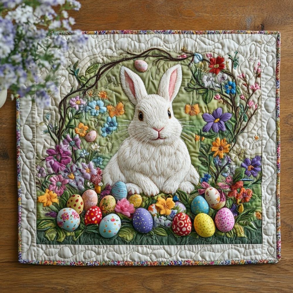 Bring playful spring charm to your table with this Blooming Bunny quilted placemat. Soft, padded cotton construction protects surfaces while the colorful appliqué bunny and floral motifs create a cheerful Easter or everyday centerpiece. Reversible design with secure stitching is machine washable for easy care—ideal for family brunches, seasonal gatherings, or gifting.