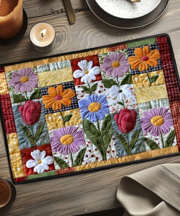 blossom placemat,floral quilted placemat,dancing flower table mat,quilted dining accessory,spring table decor,elegant placemat,table linen accent