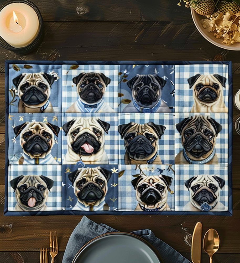 Blue Pug Quilted Placemat – Cute Dog Table Mat, Durable Cotton, Non-Slip Backing, Easy Care Gift For Pug Lovers