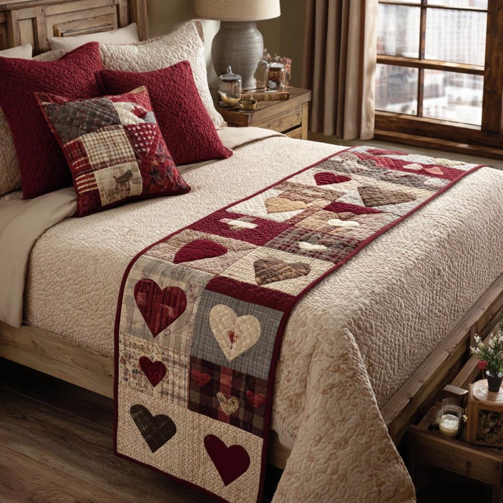 Blush Hearts Quilted Bed Runner – Romantic Pink Bed Scarf For Feminine Bedroom Styling , Soft Quilting, Decorative Throw For Queen & Full Beds