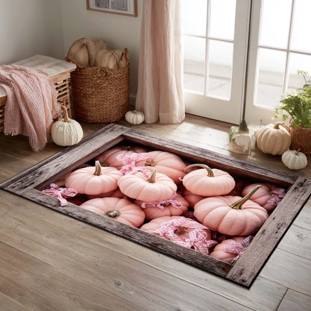 blush pumpkin rug, pumpkin patch rug, autumn area rug, low-pile decorative rug, stain-resistant rug, kids playroom rug, living room rug, cozy area rug, seasonal decor rug, blush motif rug