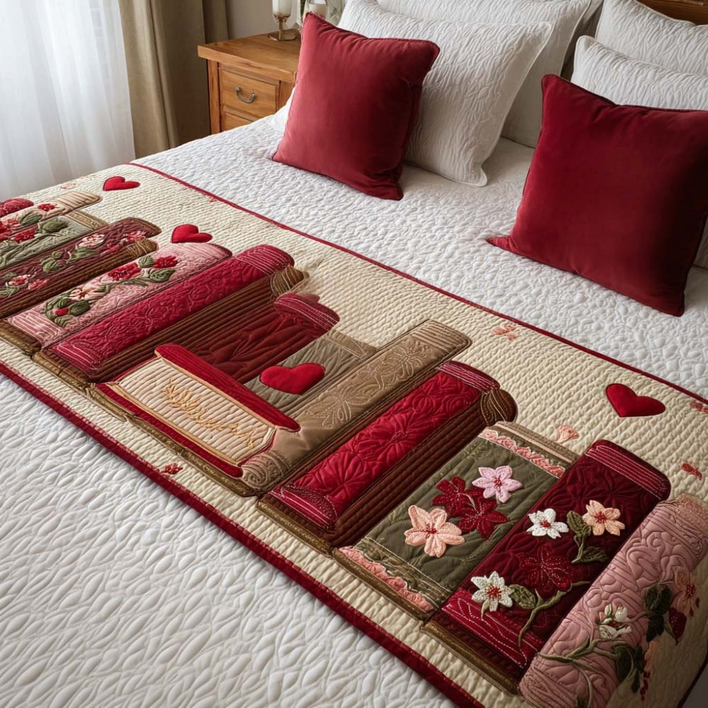 Bookish Valentine Quilted Bed Runner – Charming Literary Heart Bed Scarf For Cozy Romantic Styling , Decorative Throw For Reader-Inspired Bedrooms