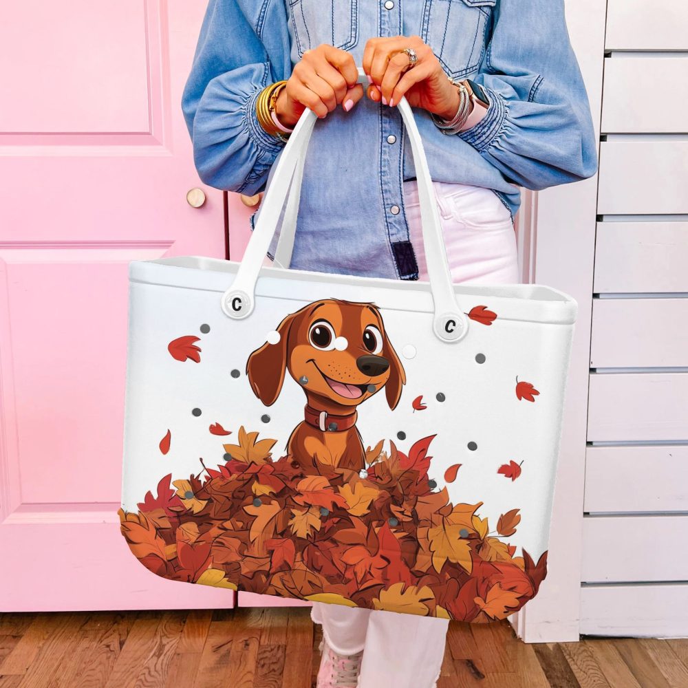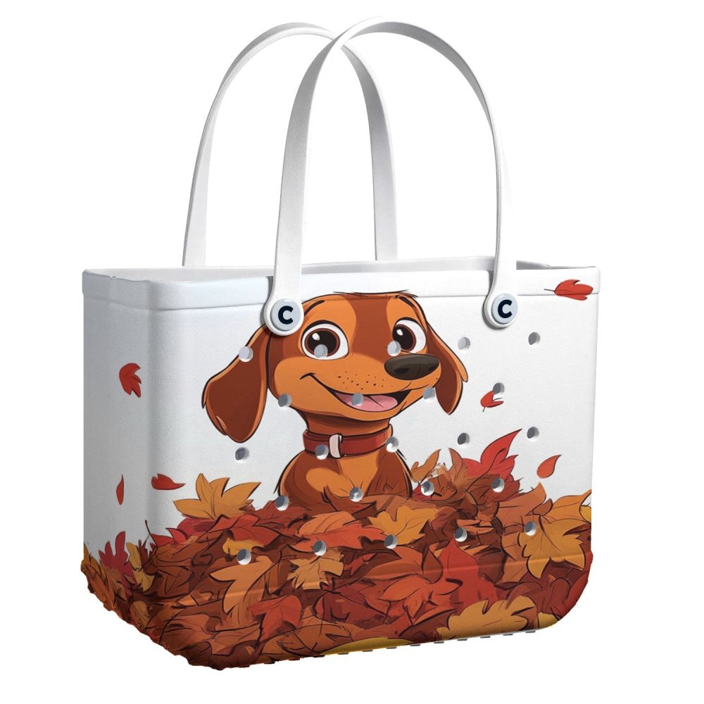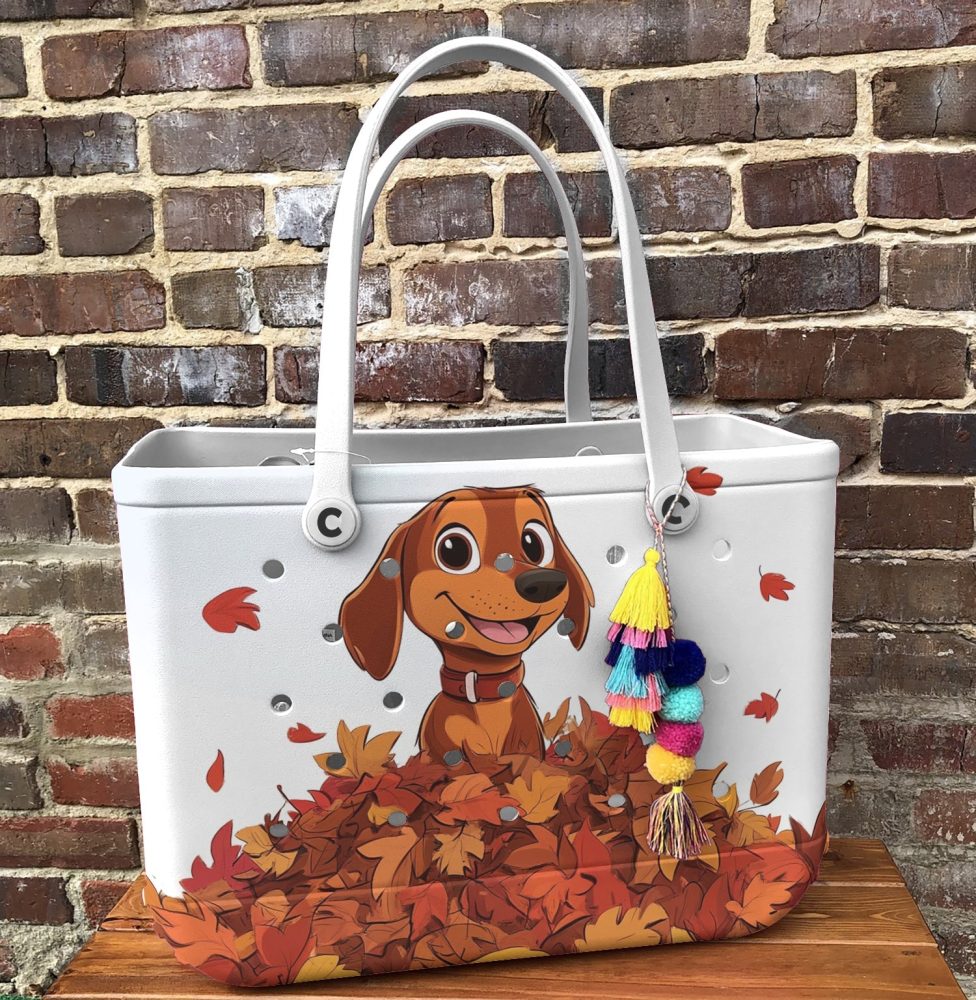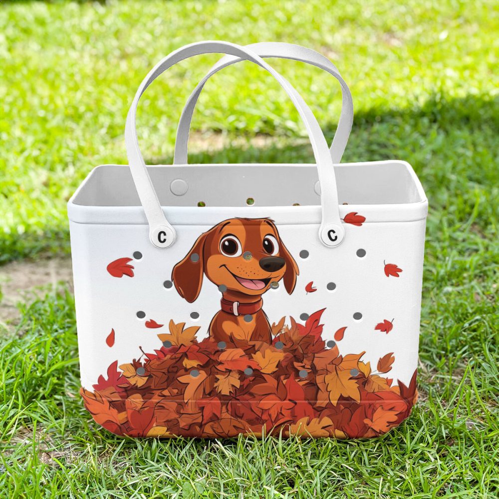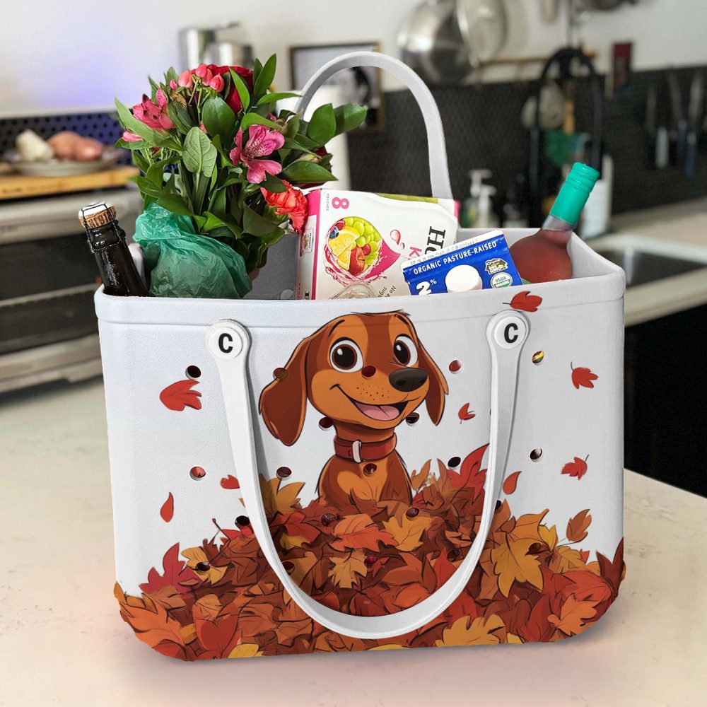 Be the first to review “Bucket Tote Bag, Limited Edition Bogg Bag, Beach Bag Puppy With A Pile Of Autumn Leaves”