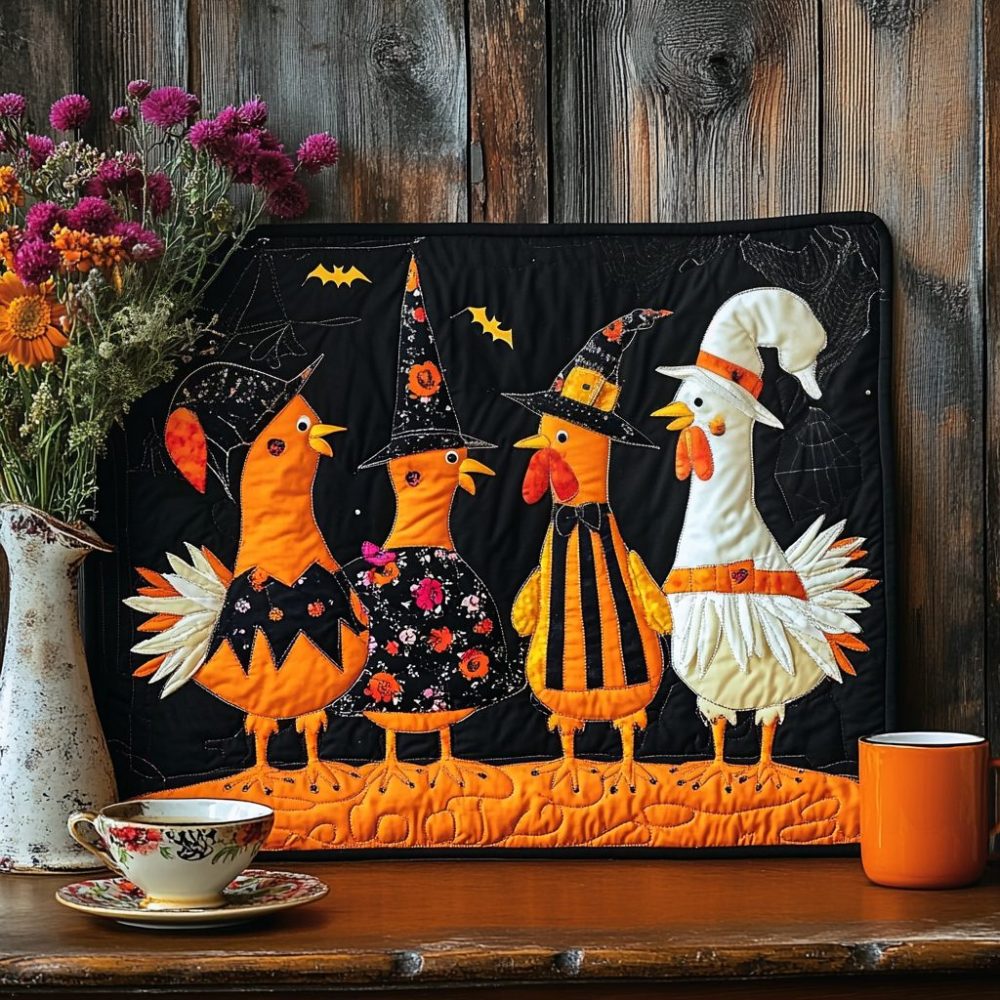 cackling chickens placemat,Halloween placemat,quilted table mat,playful farmhouse decor,insulated placemat,machine washable placemat,seasonal table accent,kitchen decor