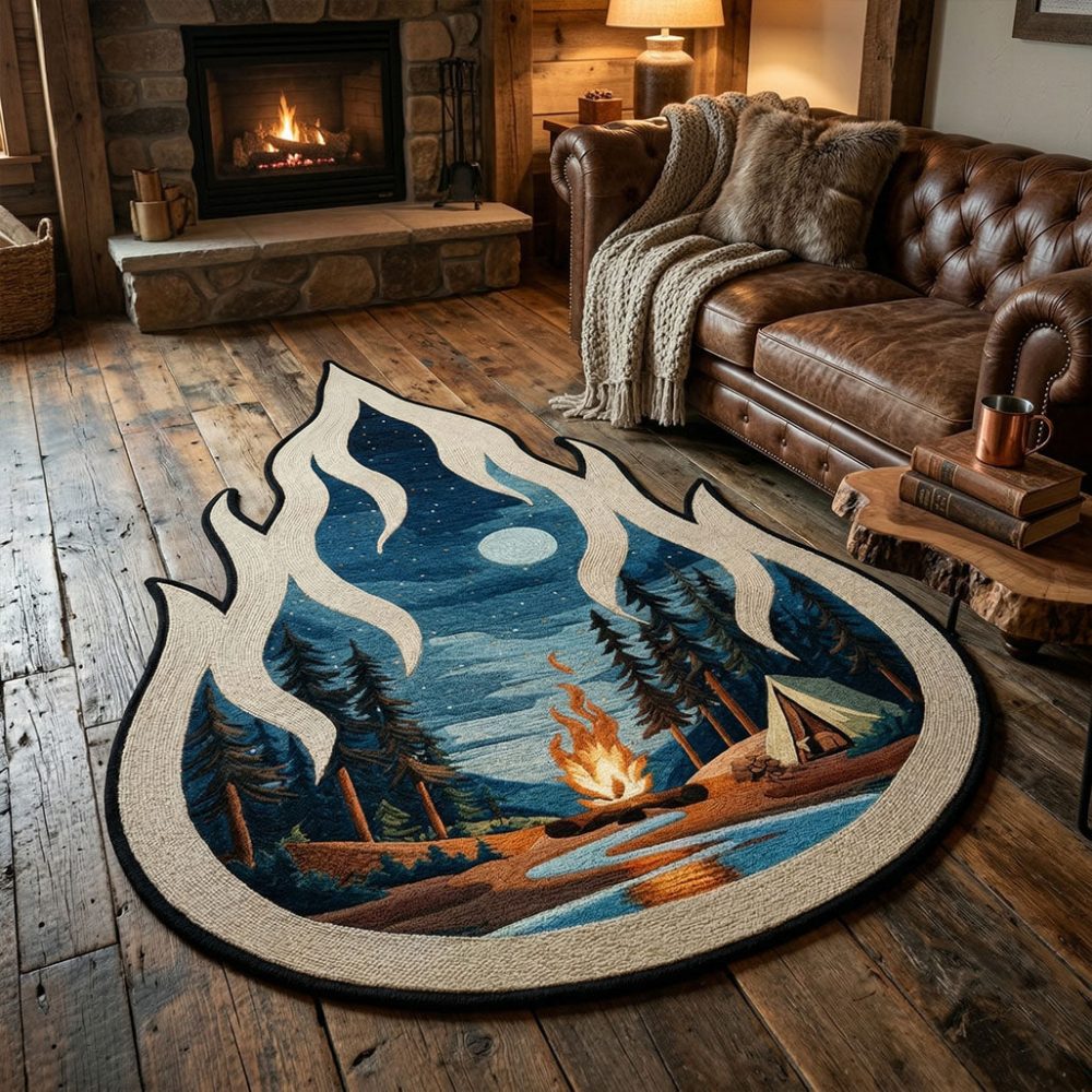 Campfire Night Scene Custom Shaped Rug — Whimsical Campfire & Starry Sky Floor Accent, Unique Cut Rug For Kids Rooms & Themed Spaces