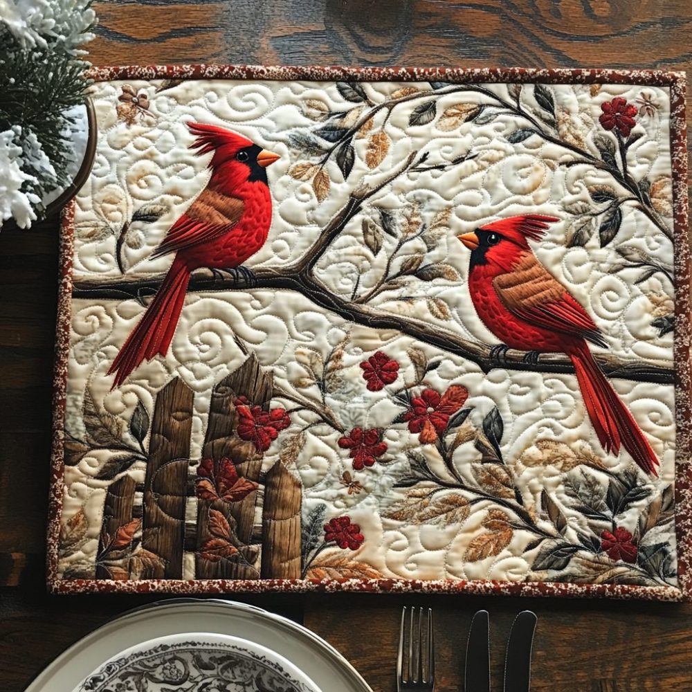 The Cardinal Melody quilted placemat blends classic bird motifs with functional quilting to protect tabletops from heat and spills. Soft cotton fabric and tight stitching ensure long-lasting use, while machine washability keeps it fresh season after season. Perfect for festive dinners, cozy breakfasts, and nature-inspired table decor.