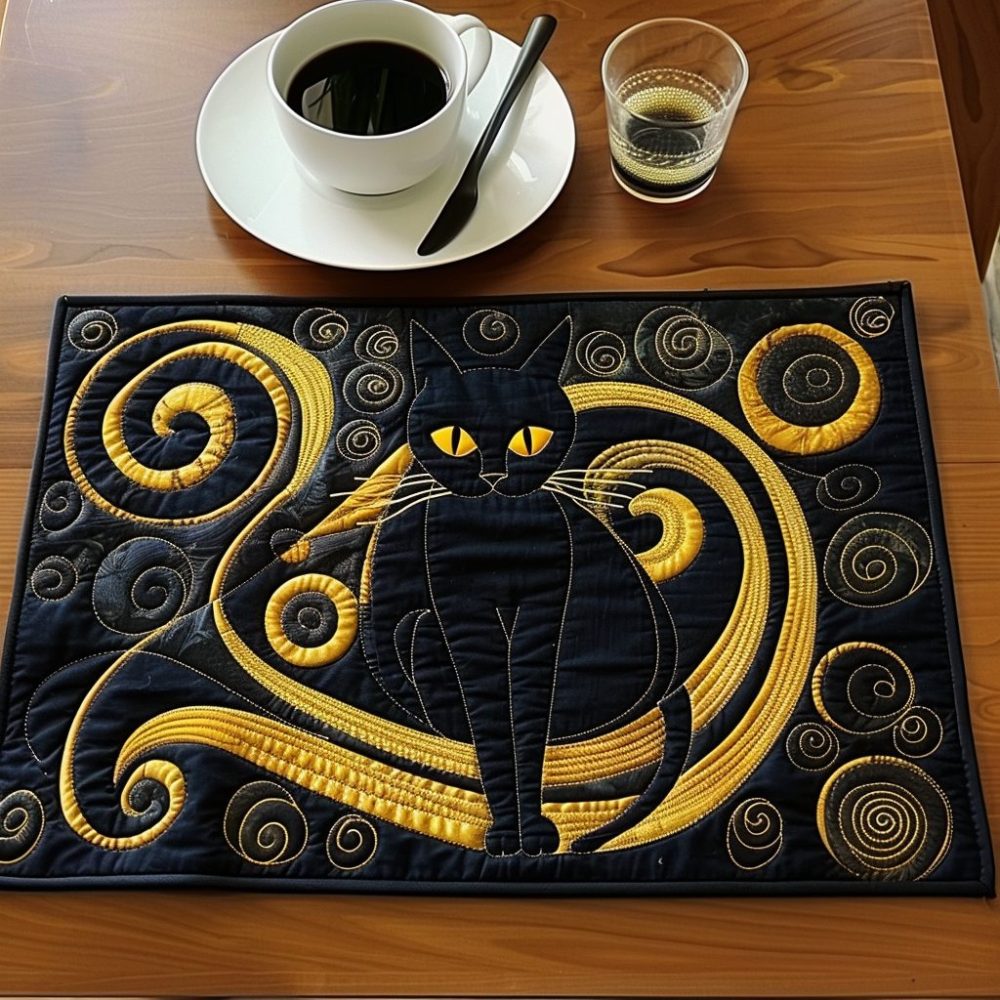 Elevate your dining with this shadowy cat magic quilted placemat featuring a dramatic noir cat motif. Soft cotton padding and non-slip backing protect surfaces while adding darkly elegant flair to your kitchen.