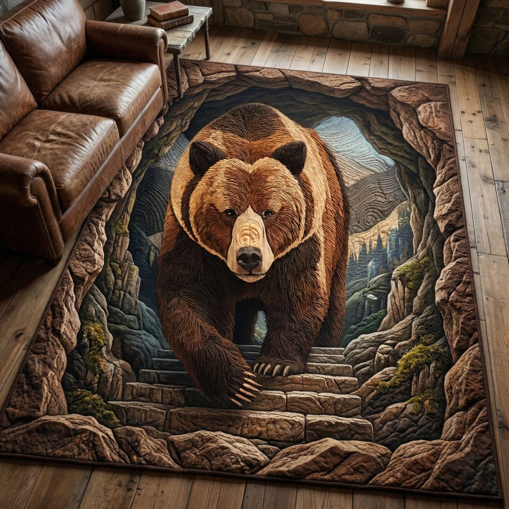 Cave Bear Rustic Area Rug — Vintage Wilderness Bear Illustration In Earth Tones, Durable Low-Pile Hallway Runner, Stain-Resistant Pet-Safe