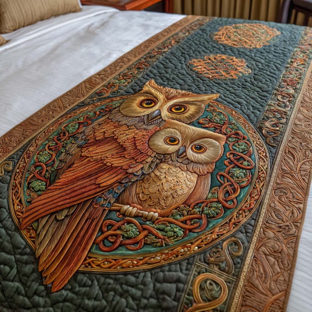 Celtic Owls Quilted Bed Runner — Heritage Knotwork & Owl Motif Accent Throw For Queen & King Beds, Timeless Rustic Charm