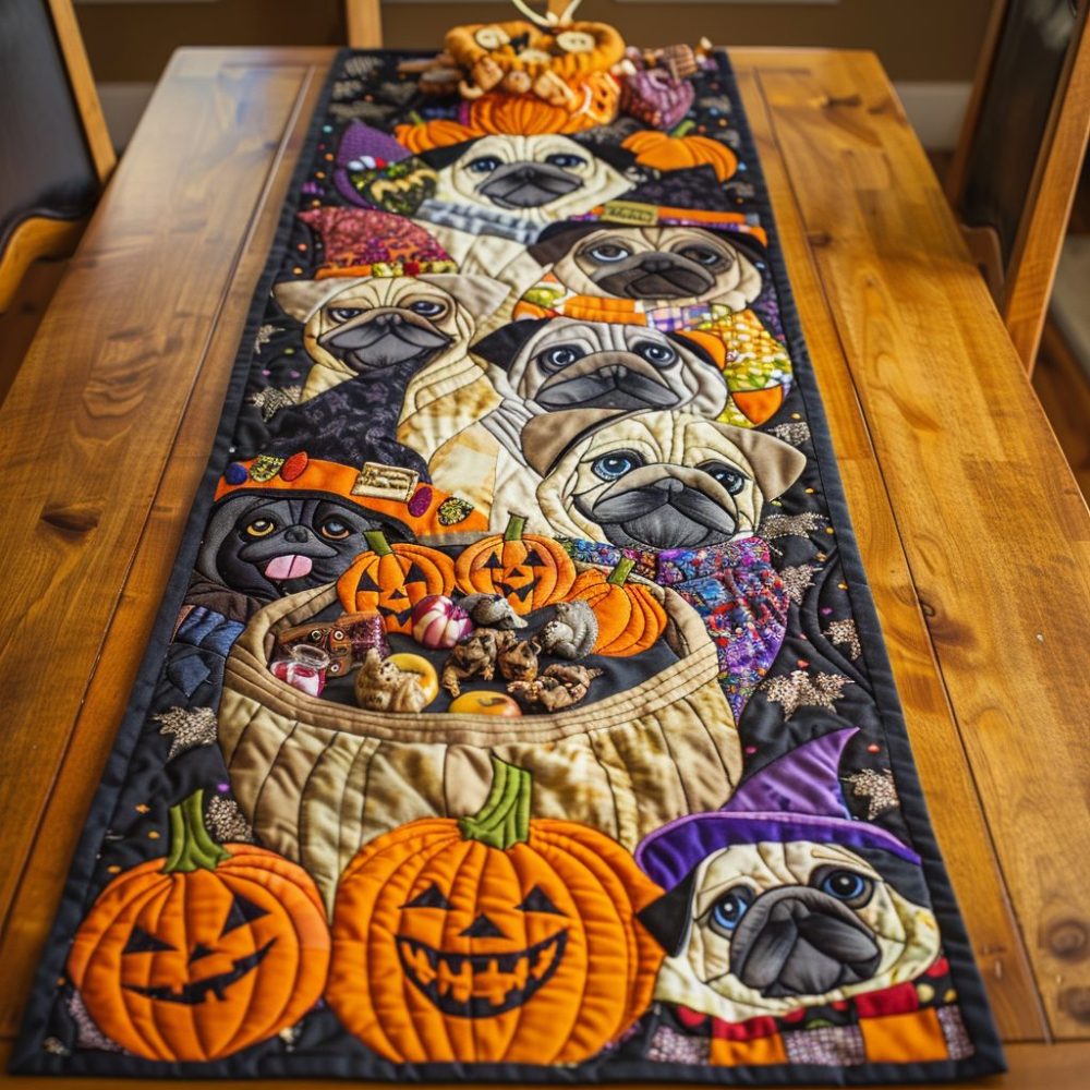 Cheerful Pugs Quilted Table Runner