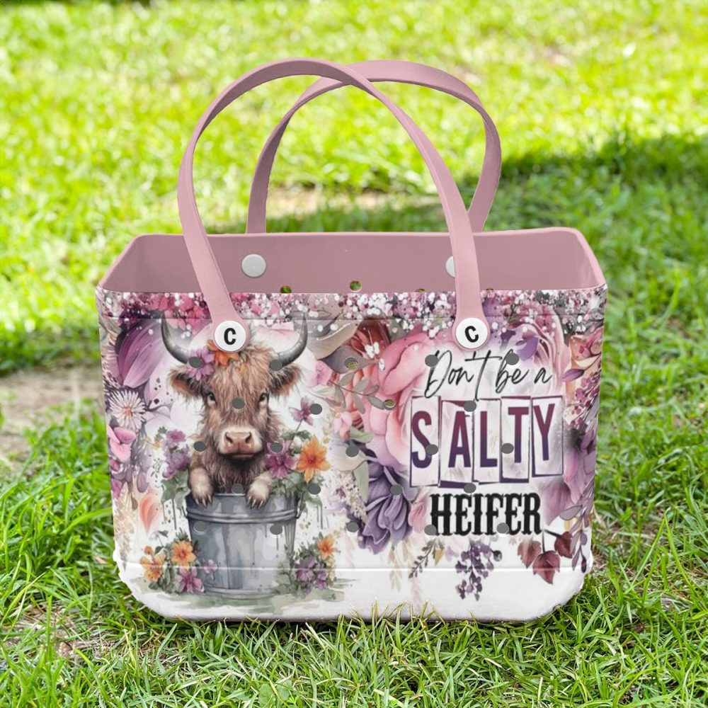 Be the first to review “Chic Floral Cow Tote Bag – ‘Don’T Be Salty Heifer’ Design, Perfect For Shopping & Beach Days!”