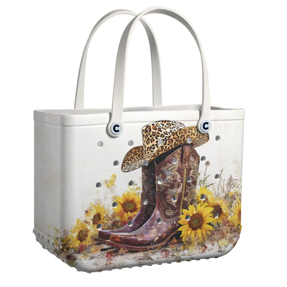 Be the first to review “Chic Western Tote Bag – Cowboy Boots & Sunflowers Design With Leopard Hat Accent”