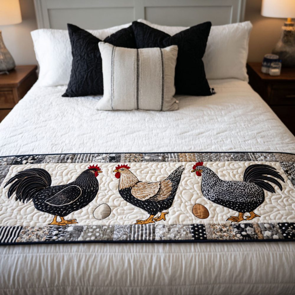 chick bed runner,quilted bed scarf,farmhouse bedding,whimsical decor,hand-quilted runner,cotton bed accent,playful bedroom accessories,reversible bed scarf,kitchen bench throw,gift idea