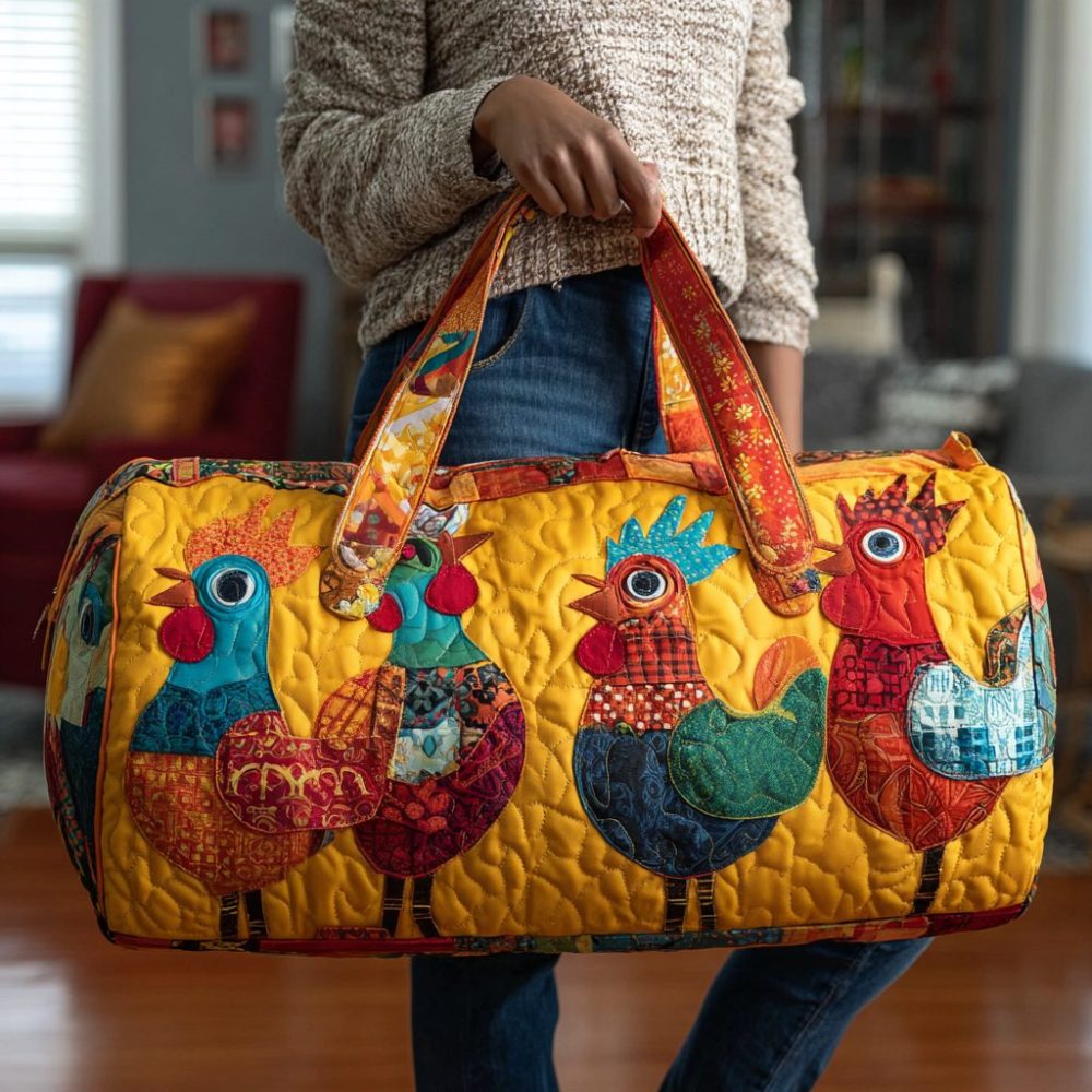 quilted duffle bag,chicken print bag,farmhouse travel bag,cottagecore duffel,animal print travel bag,weekend travel bag,overnight bag,gym duffel,carry-on bag,novelty travel bag,hand-drawn hen pattern,chicken lover gift,farm animal accessory,whimsical travel bag,small weekend bag