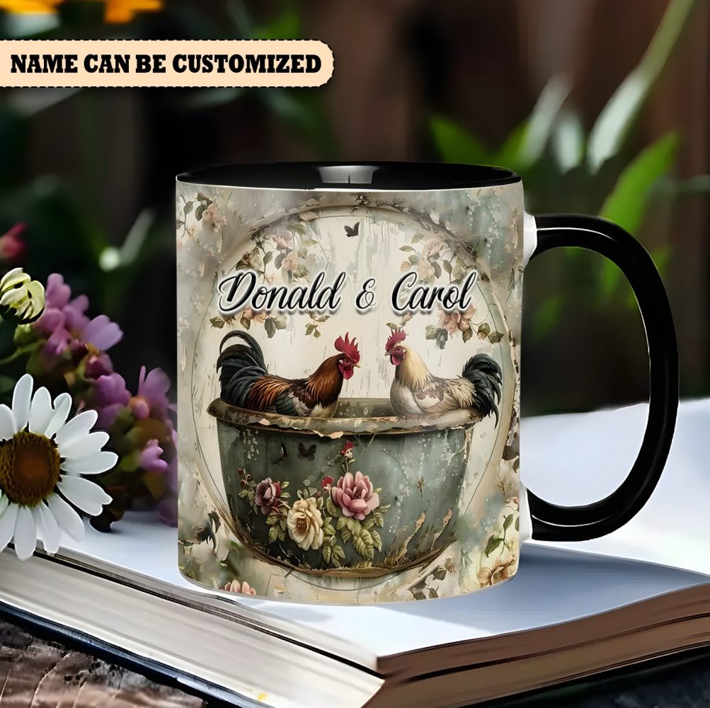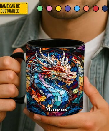 - High quality ceramic mug with two-tone rim, interior, & handle