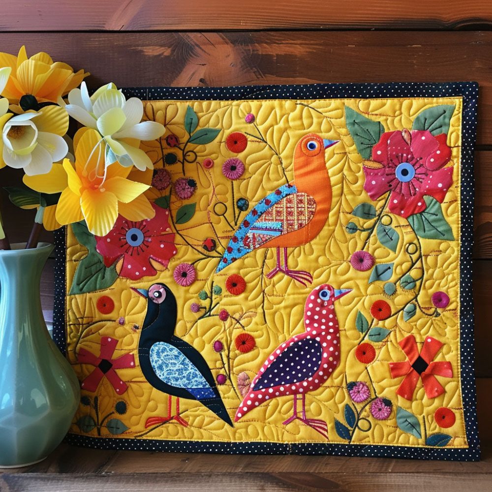 chirping blossoms placemat,spring floral placemat,quilted bird placemat,machine washable table mat,durable dining placemat,outdoor friendly placemat,garden party decor