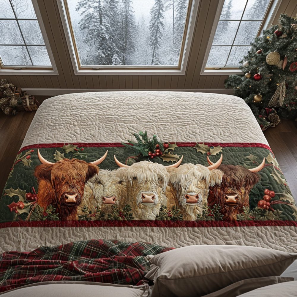Christmas Cow Horizon Quilted Bed Runner – Whimsical Farmhouse Holiday Accent, Quilted Cotton Blend, Reversible For Queen & King Beds
