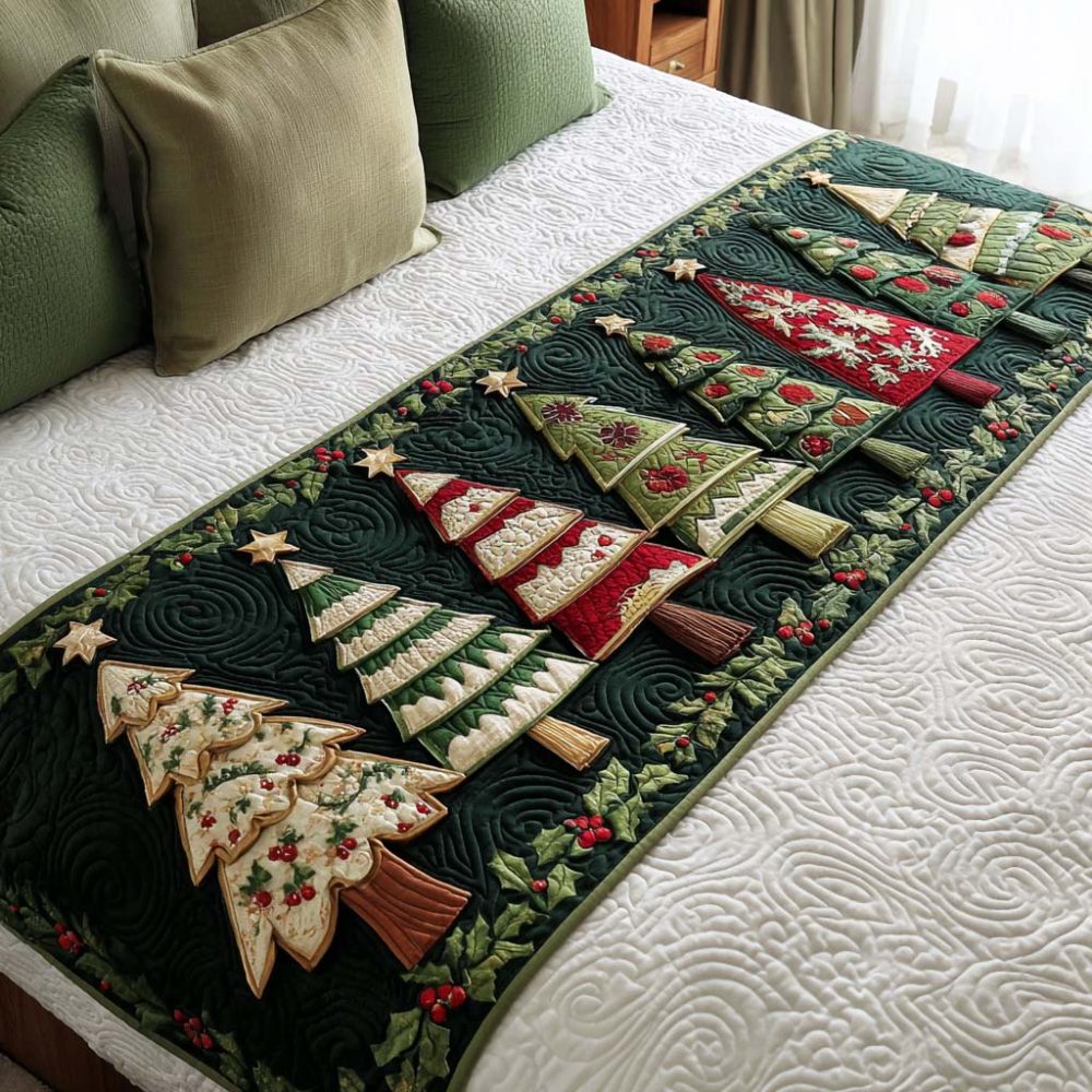 classic christmas bed runner,holiday bed runner,festive bedding accent,christmas forest runner,seasonal bedroom decor,quilted holiday throw,traditional holiday decor