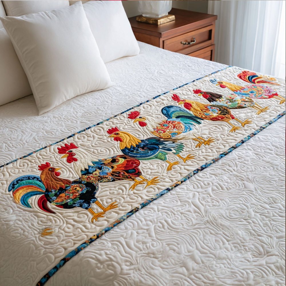 quilted bed runner,festive chicken bed scarf,seasonal bed runner,cluck celebration,farmhouse accent,lightweight quilted runner,machine washable,cheerful bedding
