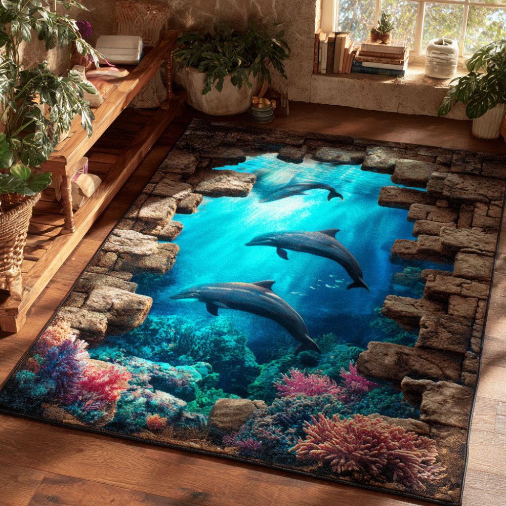 Coastal Dolphin Dance Area Rug — Nautical Ocean-Inspired Accent Rug For Beach Homes, Kids’ Rooms & Easy-Care Floors