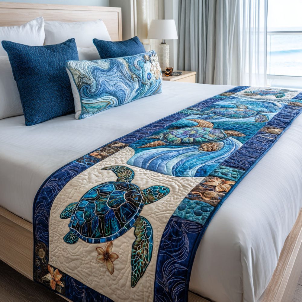 Coastal Glide Quilted Bed Runner — Nautical Wave & Stripe Decorative Throw For Beach House & Bedroom, Lightweight Quilted Bed Accent, Soft & Easy-Care