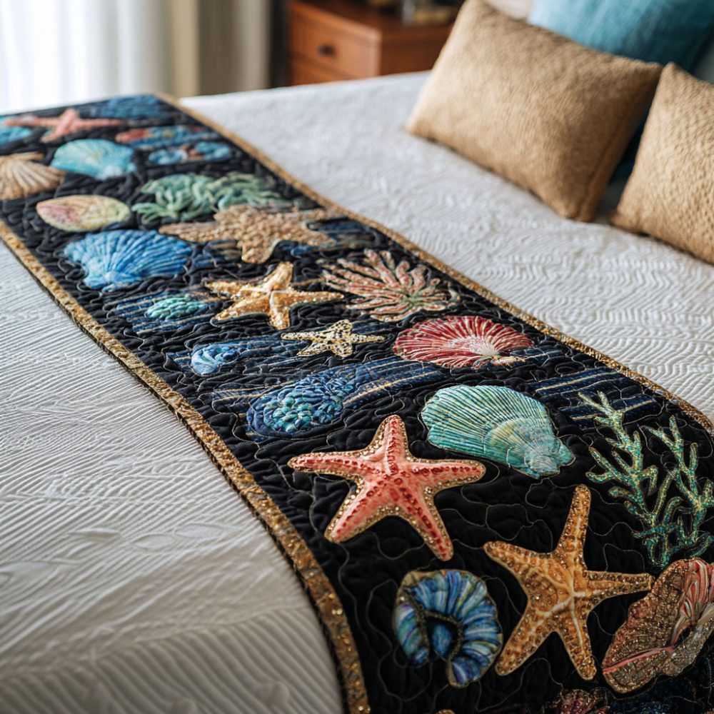 Coastal Patchwork Quilted Bed Runner — Handcrafted Patchwork Bed Scarf, Nautical Colorway, Cotton-Blend, Reversible For Queen/King