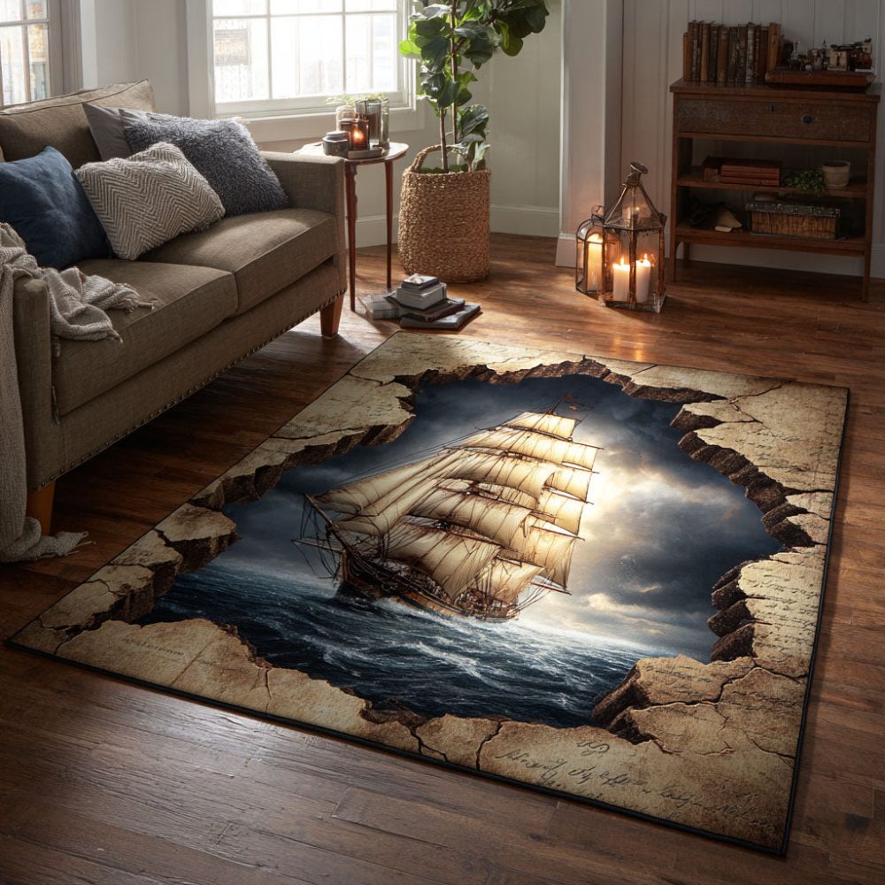 Coastal Sail Nautical Rug – Classic Sailboat Motif, Indoor/Outdoor Accent, Low-Profile Durable Weave, Fade & Stain Resistant