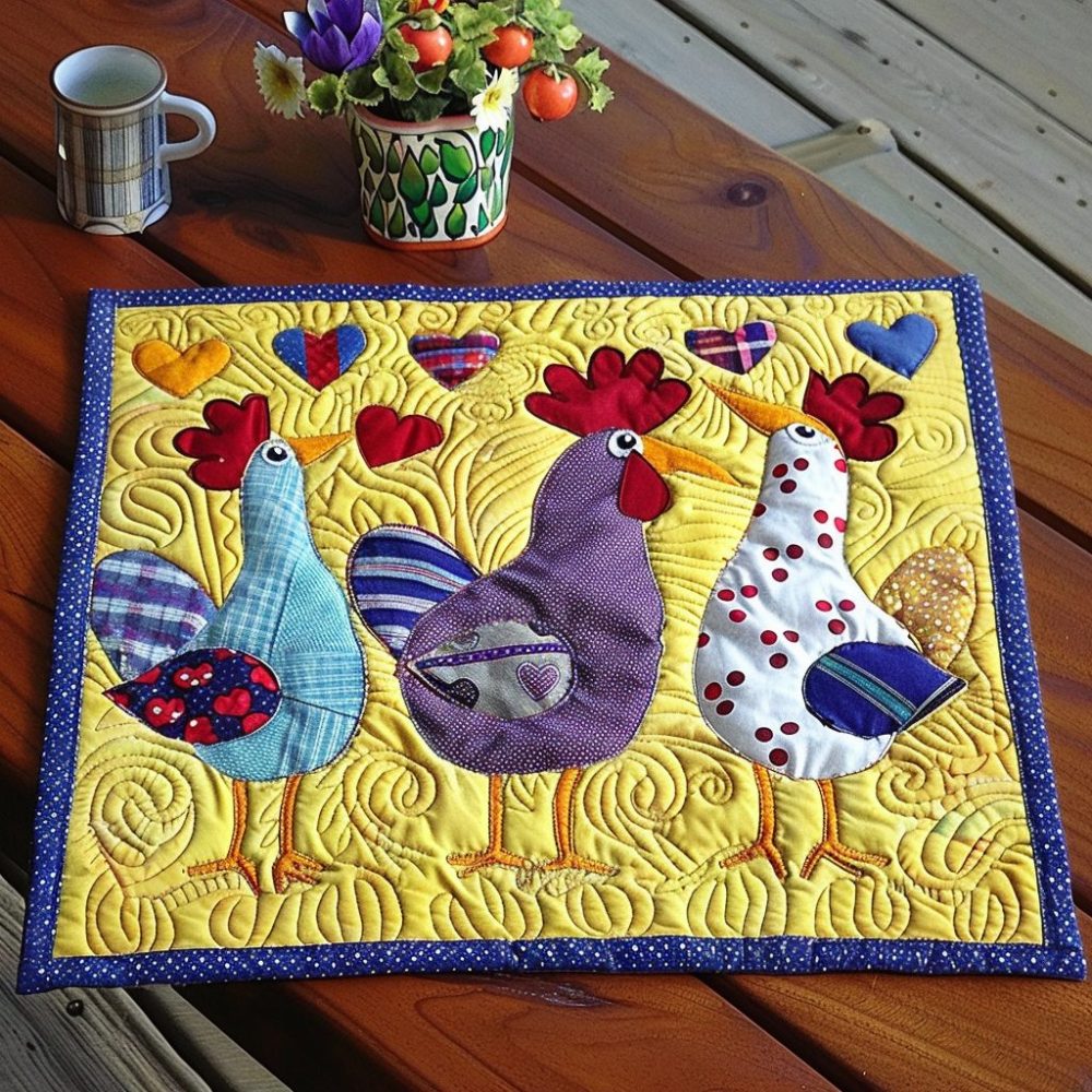 Infuse your kitchen with color using this Colorful Chickens quilted placemat, featuring lively rooster and hen artwork. The quilted cotton-blend construction protects tabletops from heat and spills while adding a playful farmyard accent to casual or country-style dining. Machine washable for effortless maintenance — a bright, fun addition for farmhouse kitchens, brunch settings, or as a quirky gift for poultry enthusiasts.