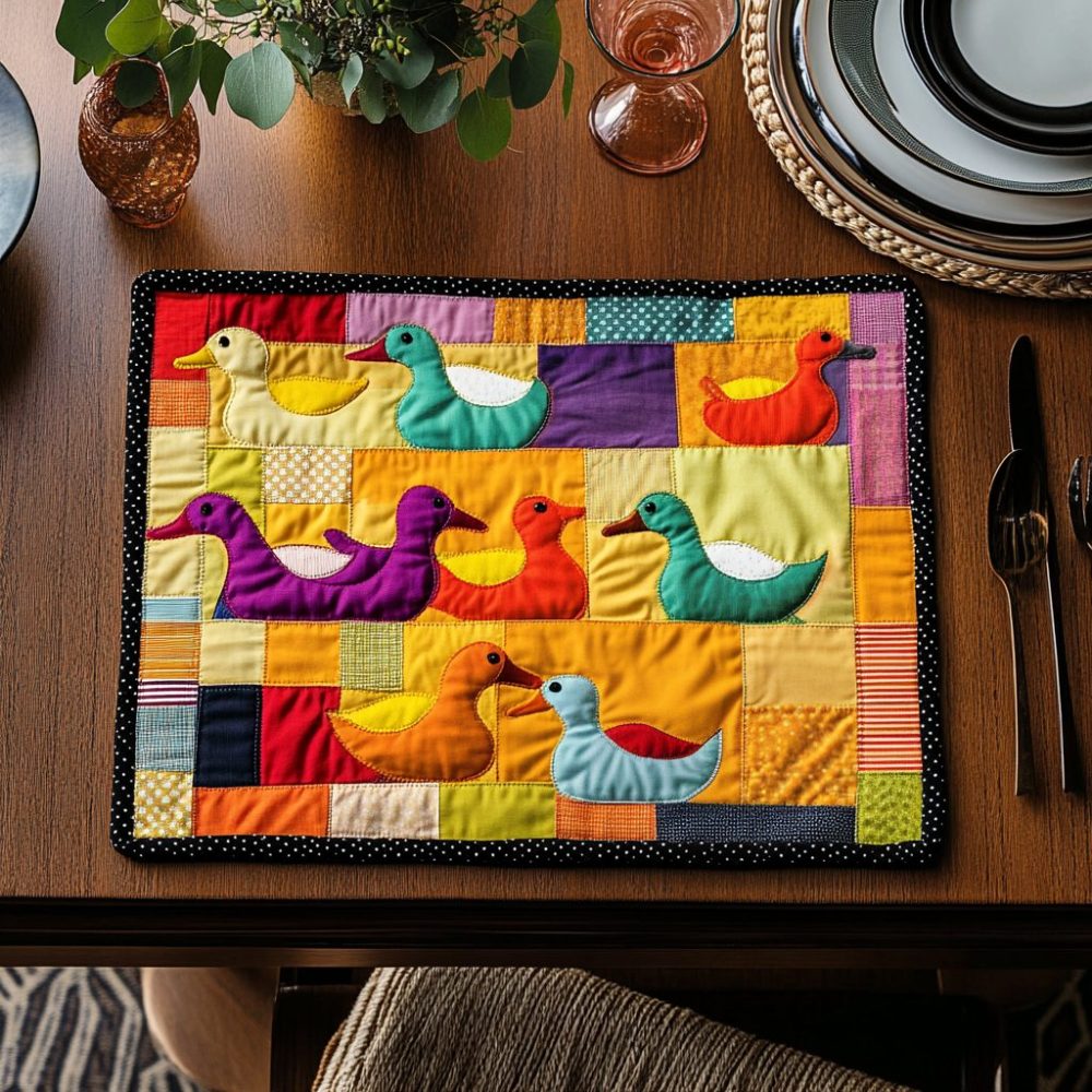 colorful duckling placemat, quilted placemat, vibrant table mat, cotton blend placemat, washable table decor, kids friendly placemat, picnic placemat