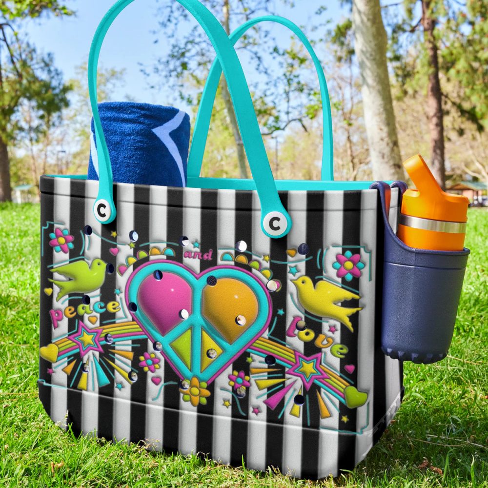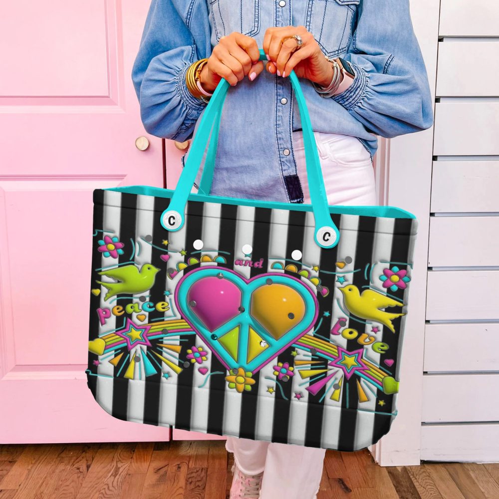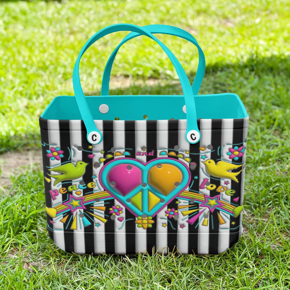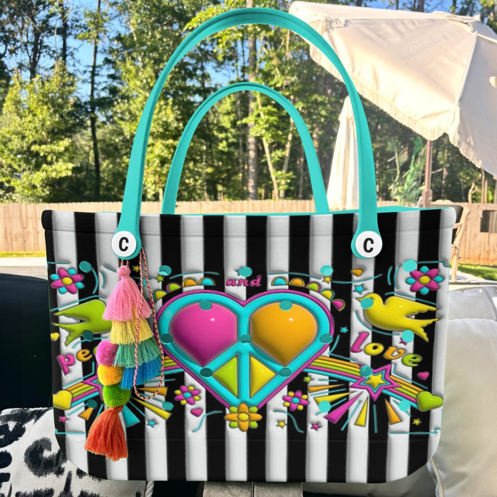 Be the first to review “Colorful Peace & Love Tote Bag – Vibrant Striped Design With Heart & Bird Accents – Perfect For Everyday Use!”