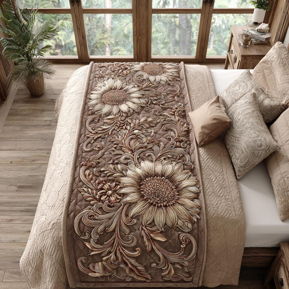 Country Sunflower Quilted Bed Runner — Rustic Floral Bed Scarf, Cotton-Blend Textured Accent, Fits Queen & King Beds, Easy Care