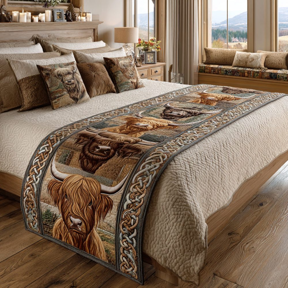 cow journey bed runner,farmhouse bed scarf,quilted scenic runner,reversible bed runner,cow motif bedding,cotton blend,queen king,country decor