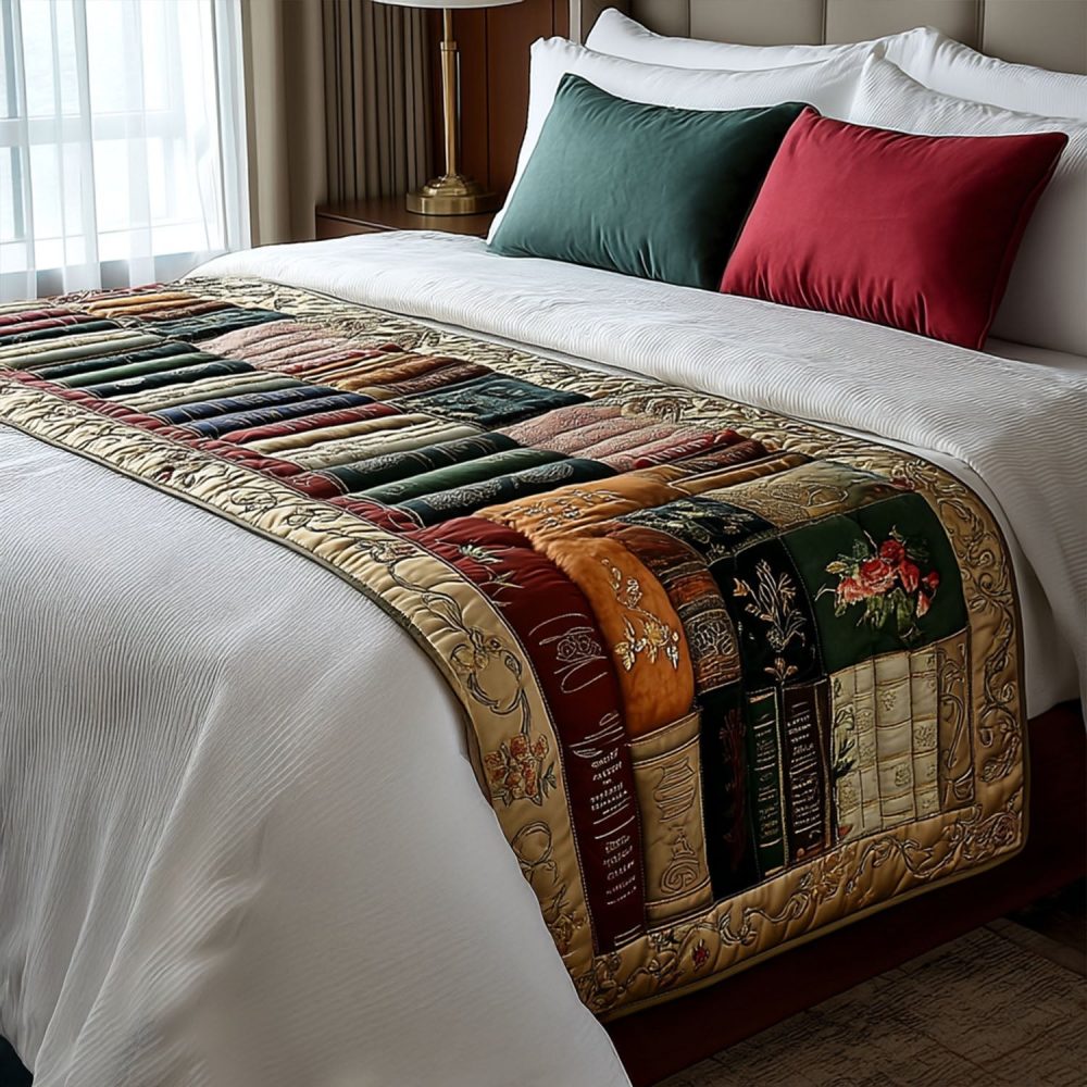 Cozy Literary Quilted Bed Runner — Hand-Sewn Cotton Throw With Bookish Botanical Motif, Luxury Bedroom Accent For Queen & King Beds