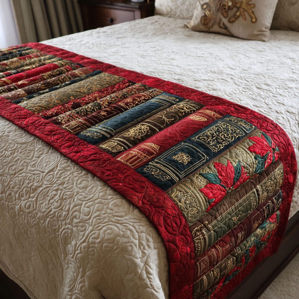 crimson bed runner,library bed scarf,quilted bed runner,red bedroom decor,cozy elegant bedding,book-themed accent,decorative bed scarf