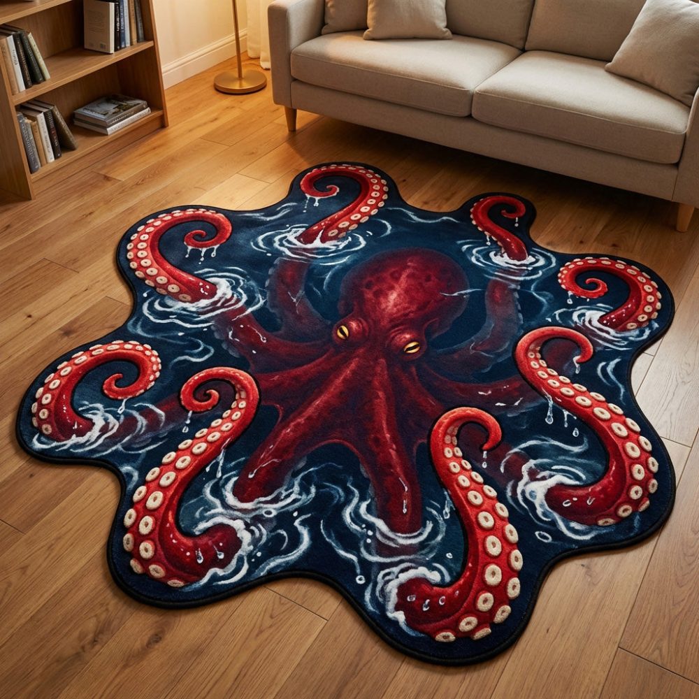 Custom Kraken-Shaped Area Rug — Unique Deep-Sea Nautical Accent Rug, High-Detail Plush Cut-To-Shape Statement Piece