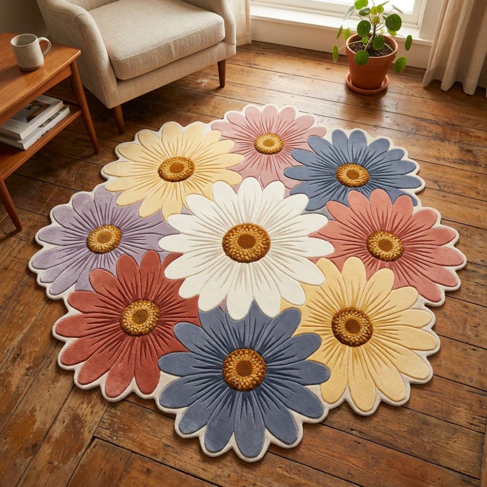 daisy fields rug, shaped area rug, floral accent rug, playroom rug, boho rug, nursery decor, shaped floral rug, washable rug