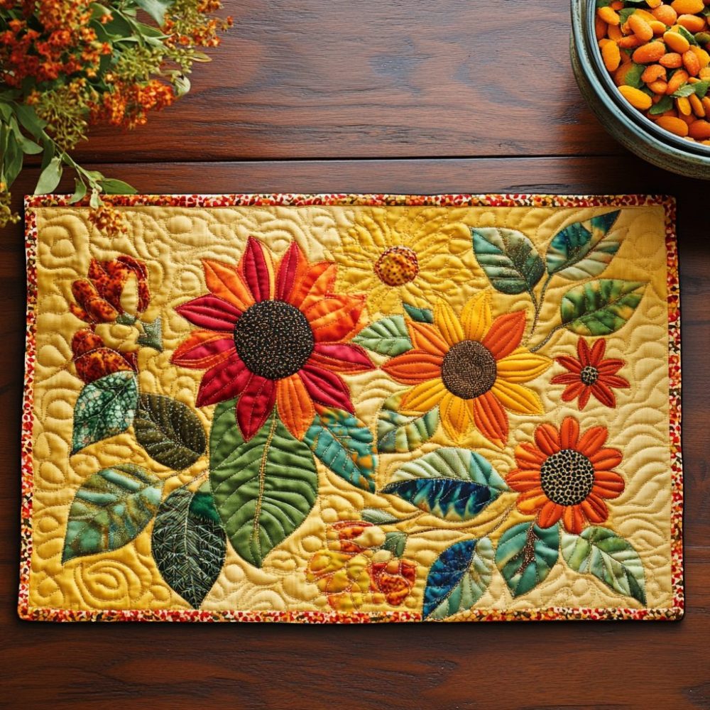 cheerful sunflower placemat,quilted dining mat,sunflower table décor,stain resistant placemat,non-slip placemat,machine washable placemat,gift for her,kitchen accessories
